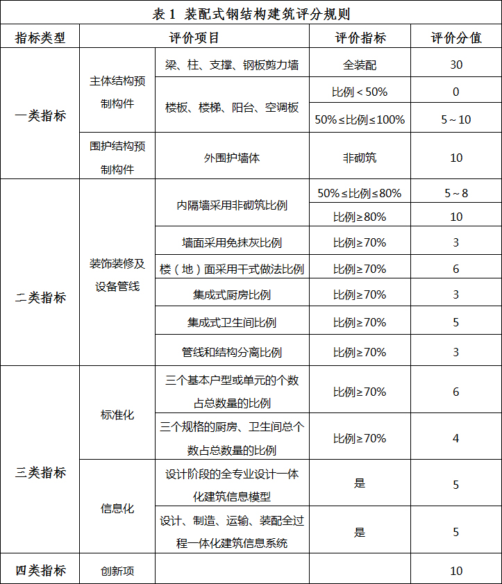 裝配式鋼結構建筑評分規則應符合表1的規定。
