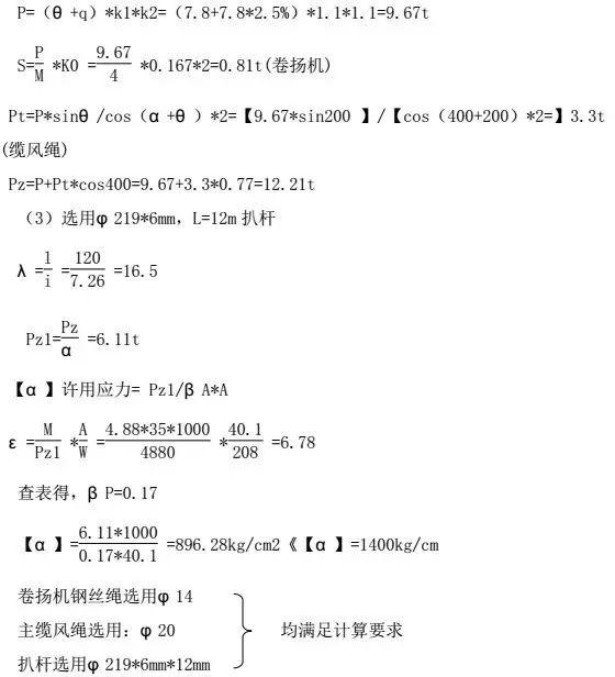 扒桿起豎在其前正后方分別設三根Φ 20╳35m主纜風(fēng)繩至扒桿頂部,正前方設二根Φ 16次纜風(fēng)繩,主、次纜風(fēng)繩的下端分別用鋼絲繩固定在砼柱下端。
