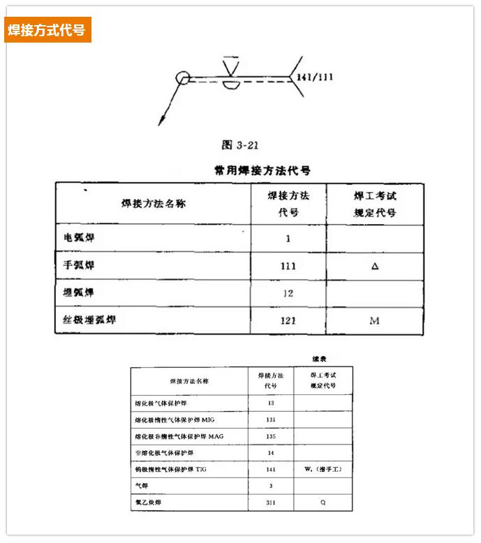在焊接結構圖樣上,焊接方法可按國家標準GB5185-85的規定用阿拉伯效字表示,標注在指引線(xiàn)的尾部。常用焊接方法代號見(jiàn)表3-9所示。如果是組合焊接方法,可用“/”分開(kāi),左側表示正面(或蓋面)的焊接方法,右側表示背面(或打底)焊接方法。例如V形焊縫先采用鎢極氫弧焊打底,后用手工電弧焊蓋面,則表示為141/111。