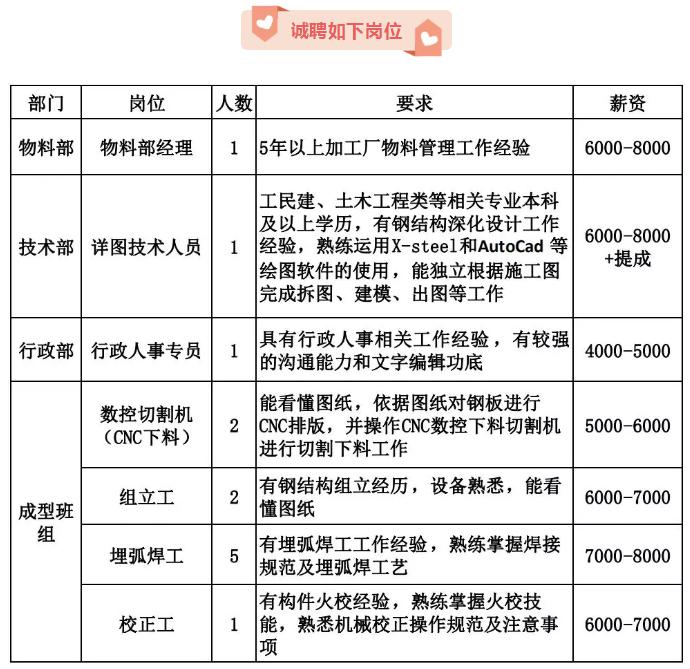 海南浙大鋼構有限公司與海南省建筑產(chǎn)業(yè)化股份有限公司共同發(fā)起設立海南省海建鋼構有限公司(暫定名)。工廠(chǎng)地址位于:老城經(jīng)濟開(kāi)發(fā)區新興路。預計7月份進(jìn)行投產(chǎn),現誠聘以下崗位,期待你的加入!
