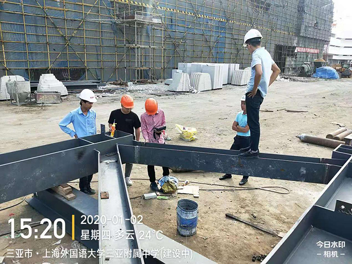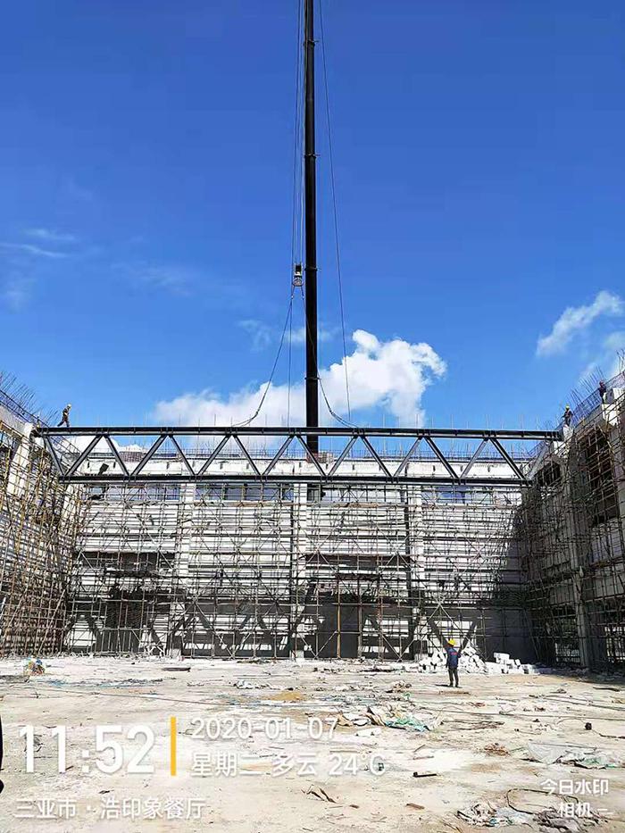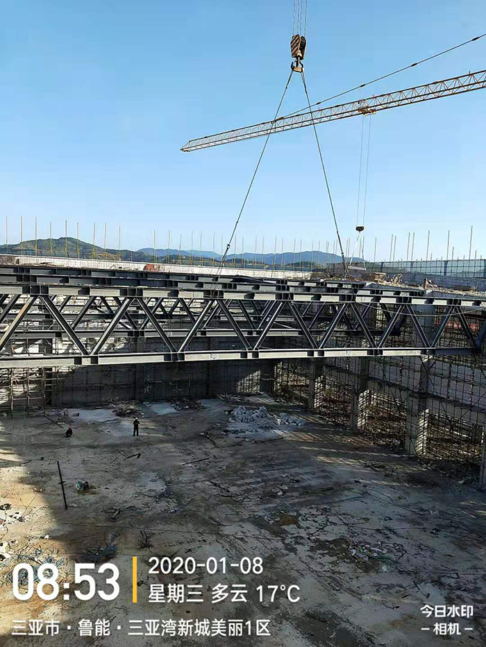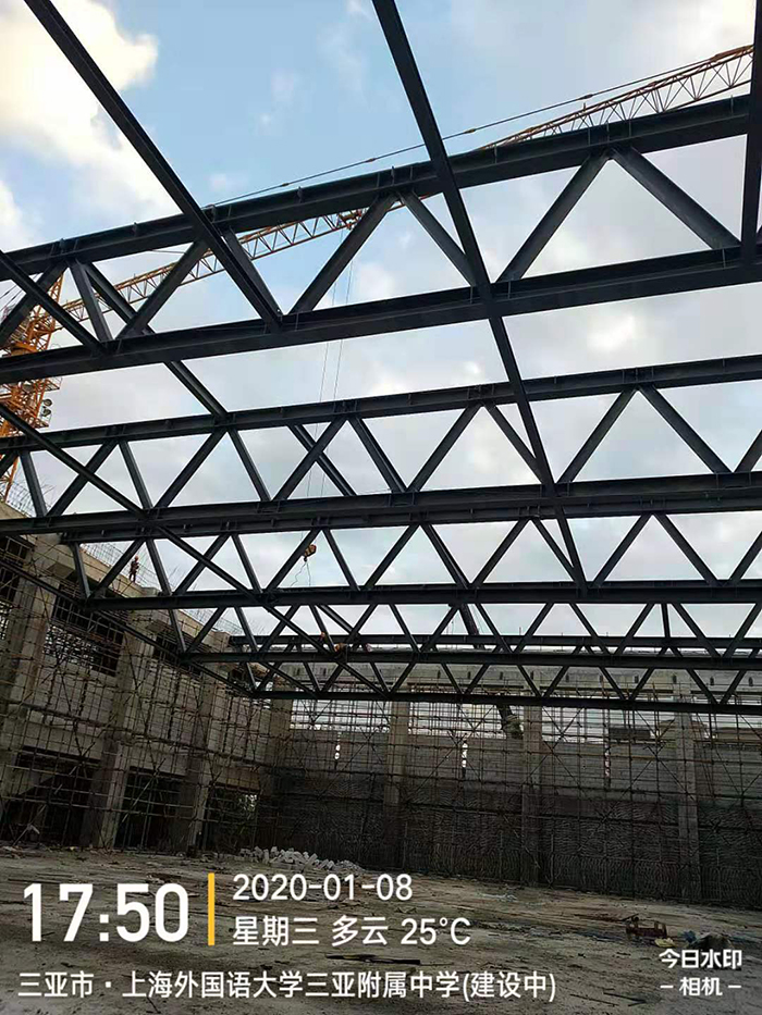 熱烈祝賀我司承接的上外三亞附中36米大跨度桁架順利吊裝完成。學(xué)校風(fēng)雨操場(chǎng)結構體系為大跨度鋼桁架結構支撐體系,跨度36米,桁架高度為3.8米。經(jīng)我司技術(shù)團隊精心組織研究,決定采取整體吊裝方案。2020年1月8日,風(fēng)雨操場(chǎng)6榀大跨度桁架采用400噸汽車(chē)吊順利吊裝完成。