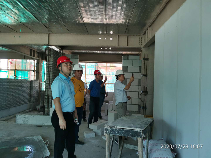 陳經(jīng)理首先帶領(lǐng)考察團參觀(guān)20#樓首層及二層,詳細介紹了本項目采用的專(zhuān)利-隱式鋼框架結構體系,具備鋼柱無(wú)內隔板、柱芯灌注自密實(shí)砼、鋼柱外包防腐防火等優(yōu)點(diǎn)。隨后考察團就桁架樓承板的安裝流程、主體安裝進(jìn)度以及樣板間的砌筑工藝、ALC墻板安裝等節點(diǎn)工藝進(jìn)行深入討論。