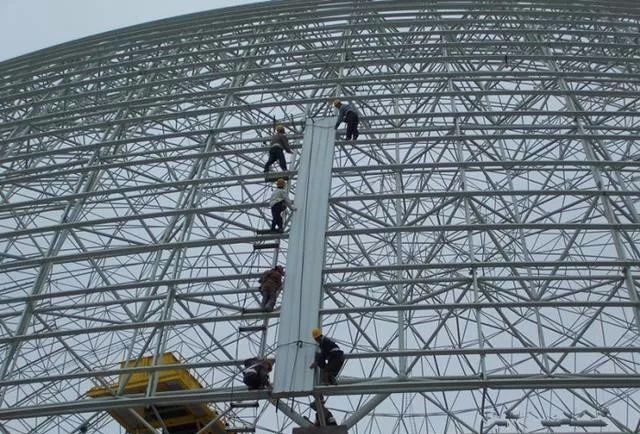 放線(xiàn)、驗線(xiàn) → 安裝下弦平面網(wǎng)絡(luò ) →安裝上弦倒三角網(wǎng)絡(luò )→安裝下弦正三角網(wǎng)絡(luò )→調整、緊固 → 安裝屋面帽頭→支座焊接、驗收