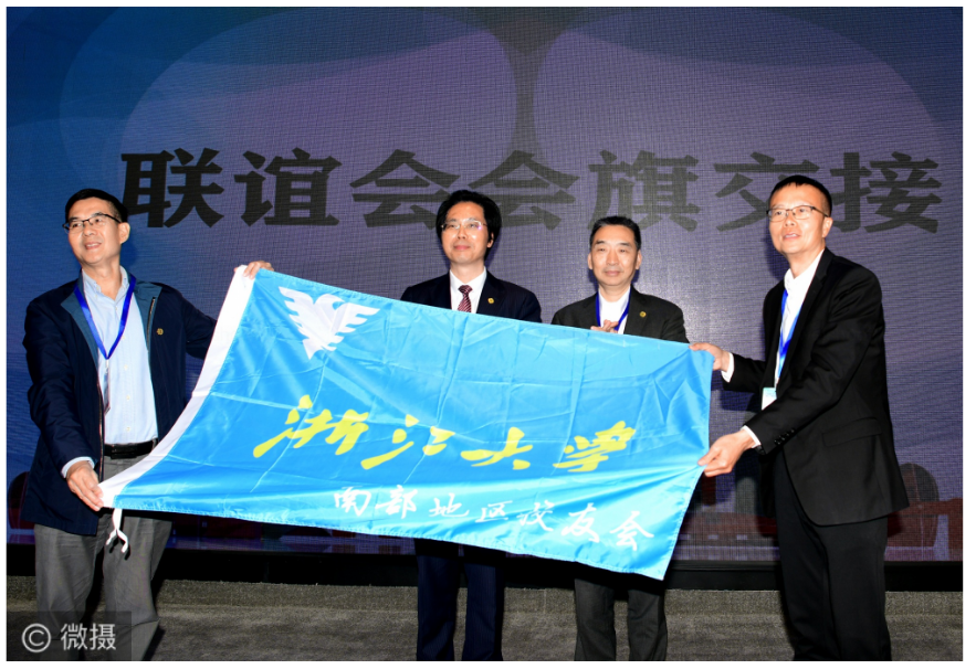 聯(lián)誼會(huì )舉行會(huì )旗交接儀式。浙江大學(xué)海南校友會(huì )會(huì )長(cháng)胡國梁將會(huì )旗交給浙江大學(xué)佛山校友會(huì )會(huì )長(cháng)陳志濤。
