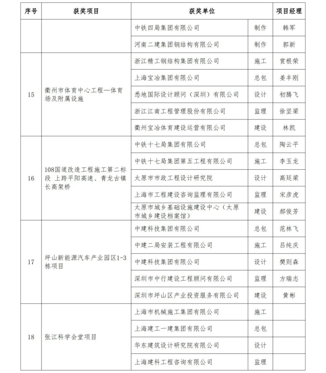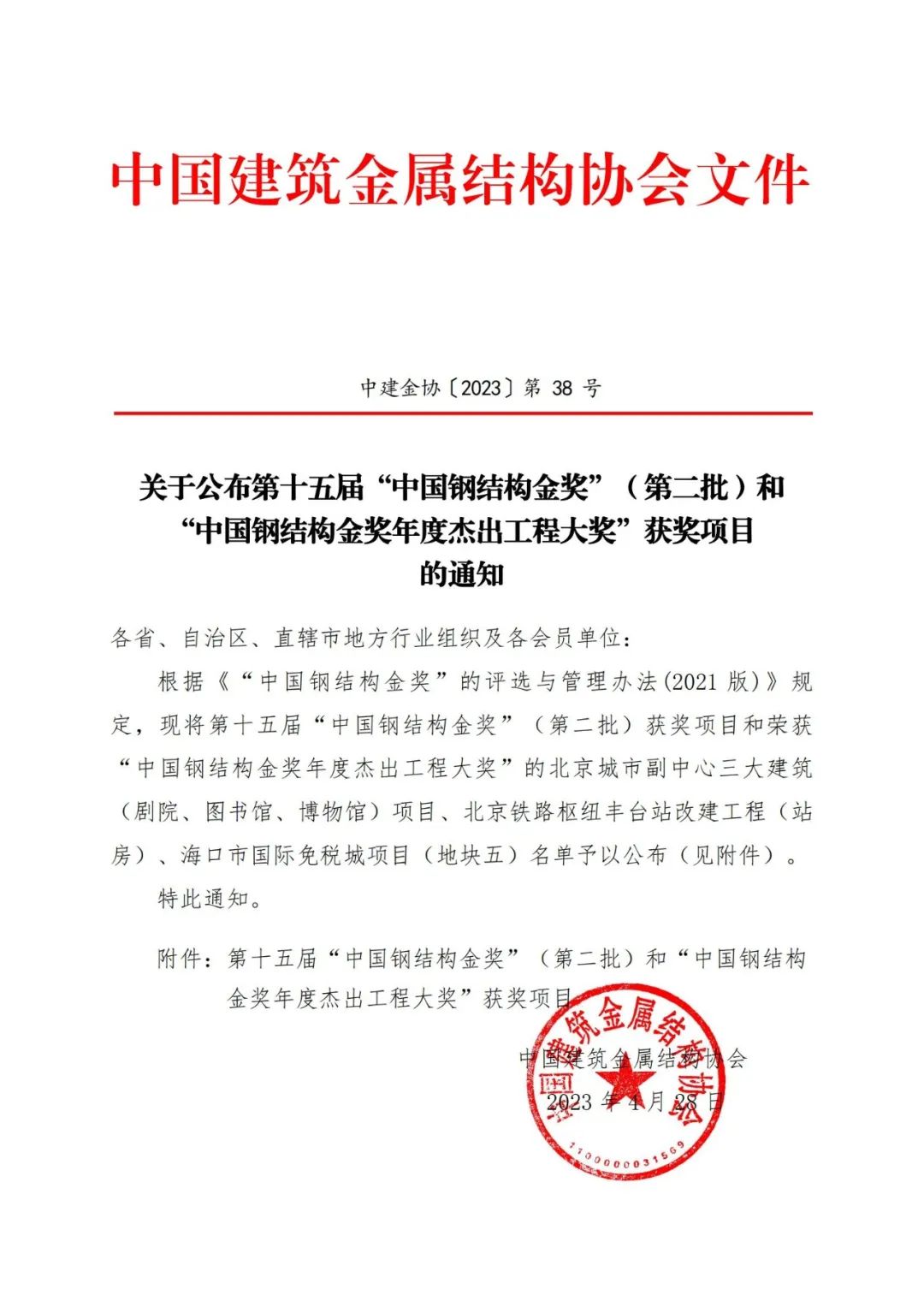【獲獎公告】關(guān)于公布第十五屆“中國鋼結構金獎”(第二批)和“中國鋼結構金獎年度杰出工程大獎”獲獎項目的通知