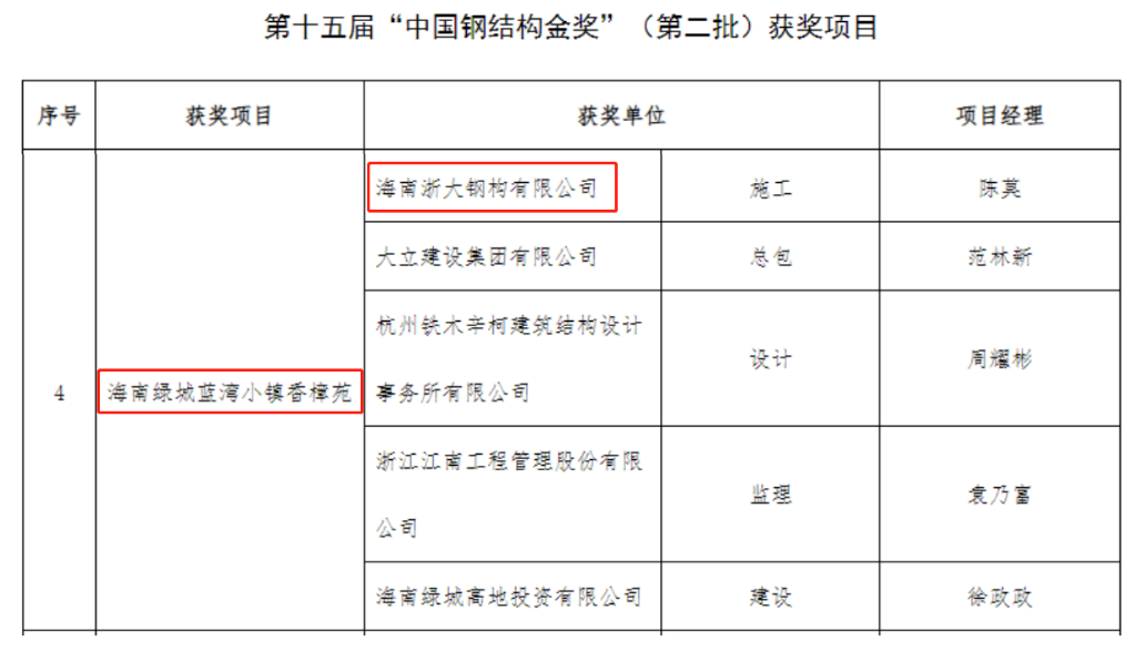 近日,中國建筑金屬結構協(xié)會(huì )公布第十五屆“中國鋼結構金獎”(第二批)獲獎項目名單。由海南浙大鋼構有限公司承建的海南綠城藍灣小鎮香樟苑項目榮獲“中國鋼結構金獎”!爸袊摻Y構金獎”作為全國性的評比達標表彰保留項目,是我國鋼結構行業(yè)工程質(zhì)量最高獎項,代表我國鋼結構工程質(zhì)量領(lǐng)先水平。